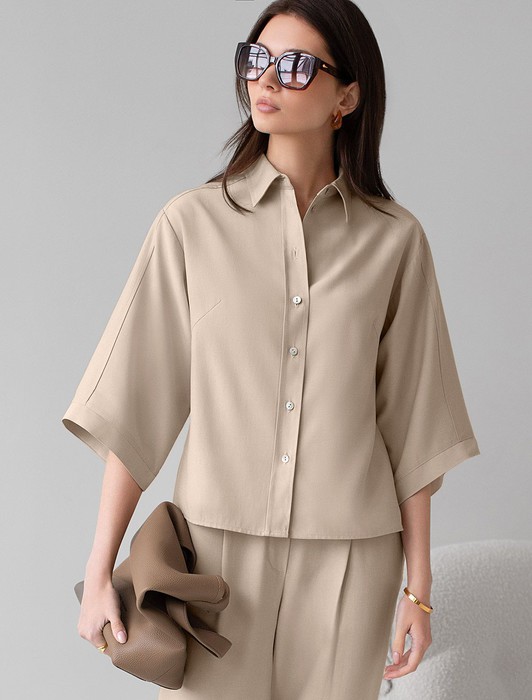 Состав: 76%Лиоцелл (Вис) 24%ПЭ Плотность: 180 Г/м2Стильная блузка светло-бежевого цвета выполнена из плотного лиоцелла. Лиоцелл это более дорогой и экологичный вариант вискозы, очень прочный и шелковистый. Модель дополнена широкими рукавами длиной 3/4, создающими модный акцент. Классический отложной воротник придает блузке официальность и идеально подходит для ношения, где требуется офисный дресс-код. А лаконичные лампасы вдоль рукавов в тон основного цвета подчеркивают трендовый характер блузки. Это ненавязчивый, но заметный акцент, который выделяет модель среди стандартных классических блузок. Свободный крой не сковывает движений и отлично садится по фигуре даже на большие размеры, скрывая возможные недостатки. Эта легкая рубашка с застежкой на пуговицы идеальный выбор для комфорта и стиля в теплое время года, она идеально подойдет для любого повода..