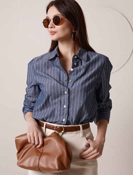 Состав: 100%Хлопок Плотность: 106 Г/м2Блузка свободного силуэта серого цвета в синюю полоску из 100 % хлопка идеально подходит для теплого сезона и порадует всех, кто ценит комфорт и стиль. Натуральный материал плотностью 106 Г/м2 обеспечивает приятное ощущение на теле и хорошо пропускает воздух, что особенно важно летом и весной. Блузка с длинным рукавом обладает высокой износостойкостью, что позволяет сохранять привлекательный внешний вид даже при регулярном использовании. Ткань хорошо держит форму после стирки и надолго остается аккуратной. Классическая рубашка с отложным воротником и широкими манжетами формирует актуальный образ, подходящий как для работы, так и для повседневных прогулок. Пуговицы на планке добавляют практичности и позволяют регулировать степень открытости, что также способствует созданию различных вариантов ношения, например, в качестве второго слоя. Прямой свободный крой рубашки не сковывает движения и создает ощущение легкости, а принт в полоску делает образ выраженным, современным и подчеркивает индивидуальность. Повседневная блузка гармонично сочетается с любыми низами, что делает ее универсальной частью гардероба.