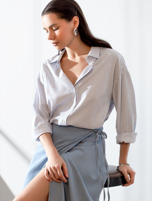 Состав: 65%Хлопок 35%ПЭ Плотность: 112 Г/м2Блузка белого цвета в голубую полоску свободного силуэта отлично подходит для повседневной носки и создания стильных образов. Уникальность этой блузки в использовании техники поперечного кроя, когда некоторые детали, такие как боковые части переда, кокетка спинки и манжеты, скроены поперек. В полосатой ткани это смотрится максимально эффектно и добавляет нотки стиля кэжуал в классический образ. Такой вид полосатой ткани называется пестротканой — полосы созданы переплетением нитей разных цветов. Смешанный состав ткани идеален для деловых блузок: хлопок приятен к телу, полиэстер повышает долговечность. Свободный крой блузки и спущенная линия плеча позволяют вписать эту вещь в любой гардероб, независимо от выбранного стиля — будь то офисная атмосфера или расслабленный выход на прогулку. Отложной воротник аккуратно подчеркивает утонченную линию шеи и придает образу завершенность. Застежка на пуговицы обеспечивает комфортную регулировку и удобство в использовании. Универсальная рубашка хорошо смотрится на любые размеры, в том числе и большие, скрывает возможные недостатки и выгодно подчеркивает достоинства фигуры, подходит для работы даже в жаркое время года.
