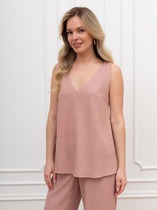 Блузка женская из гладкокрашеного тканого полотна, свободного силуэта, без рукавов, слегка расширенная к низу, с глубокой горловиной V-образной формы, вытачками в области груди.