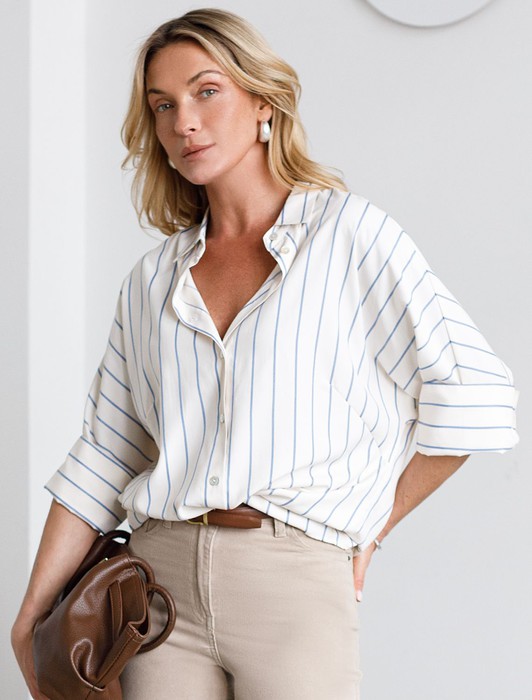 Состав: 75%Хлопок 25%ПЭ Плотность: 108 Г/м2Стильная блузка молочного цвета в голубую полоску идеально держит форму и подчеркивает любую фигуру. Свободный крой с цельнокроеным рукавом 3/4 создает эффект легкой непринужденности и комфорта, а манжеты на рукавах добавляют аккуратности и завершенности образу. Отложной воротник придает блузке классическую нотку, которая гармонично сочетается в деловом образе. Хлопок гарантирует отличную посадку, подчеркивая достоинства и скрывая недостатки, при этом сохраняет свежесть на протяжении всего дня. Такая рубашка станет великолепным выбором для тех, кто ценит удобство и стиль одновременно. Модель удачно сочетается с различными предметами гардероба, позволяя создавать стильные и практичные образы в любую погоду.