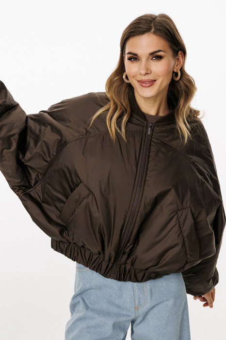 Куртка выполнена из плащевой ткани с утеплителем Isosoft. Куртка О-образного силуэта, длиной выше линии бедер. Куртка двусторонняя. Спереди застежка на молнию и карманы. Рукав покроя кимоно переходящий в кокетки спереди и по спинке. Низ рукава на притачной манжете из трикотажного довяза. Горловина округлой формы с вортником-стойкой из трикотажного довяза. Низ куртки на притачном поясе с эластичной тесьмой внутри. Одна из сторон куртки декорирована на спинке нашивкой из натуральной кожи.