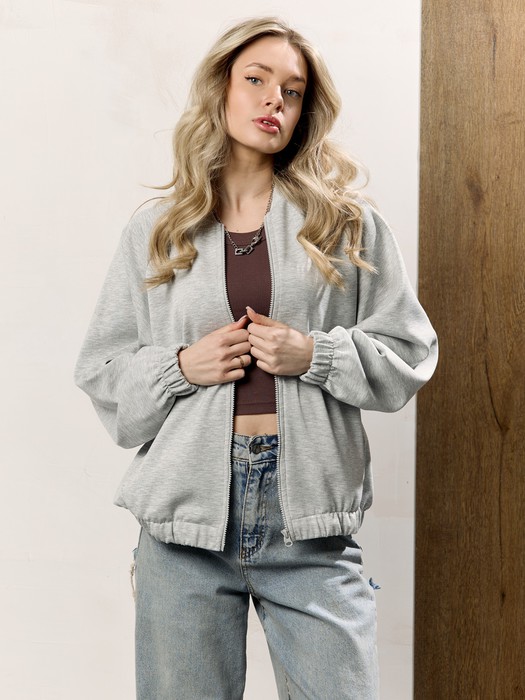 Куртка – бомбер женская из трикотажного гладкокрашенного полотна «скуба» свободная, с горловиной овальной формы обработанной втачной планкой, длинными рукавами кроя «реглан», обработанными подгибкой с эластичной тесьмой внутри, центральной бортовой застежкой на тесьму «молния». На полочке в рельефных швах выполнены карманы. Низ изделия обработан подгибкой с широкой эластичной тесьмой внутри.