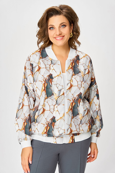 Бомбер женский из поливискозной ткани свободного кроя со спущенной линией плеча и с центральной застёжкой на молнию. В боковых швах обработаны карманы. Горловина округлая со стойкой из трикотажного довяза. Рукав длинный. По низу рукава и изделия - довяз.