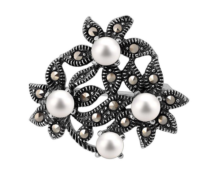 Вес: 3.77 г Вставка: Марказит Цвет камня: Белый Производство: Таиланд Покрытие: Оксидирование Количество: 4Брошь, арт.656351 Серебро Серебро 925, 3,77 гр., жемчуг , марказит