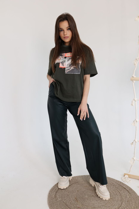 Широкие брюки из эко-кожи на хлопковой основе с резинкой по талии и боковыми карманами.