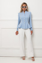 Брюки со стрелками, зауженные к низу. По передним половинкам выполнены наклонные карманы и складки по талии. По задним половинкам обработаны талиевые вытачки. В среднем шве передней половинки брюк обработана застежка на молнию. Брюки на притачном поясе с эластичной тесьмой и застежкой на петлю и пуговицу.