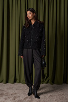 Брюки прямого кроя выполнены из текстильного полотна черного цвета. Характеристики: прямой крой, пояс стабильный, по поясу нашиты шлевки, декоративная сборка по передней части, заутюженные стрелки по переднему и заднему полотну брюк, в боковых швах карманы, застежка на молнию и 2 крючка. Длина изделия 111 см.