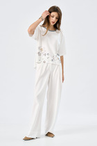 Брюки свободного кроя, выполнены из мягко полотна велюра графитового цвета. Характеристика: свободный корой, пояс на резинке, по низу брюк черное кружево. Длина брюк по боковому шву с учётом кружева 101 см.