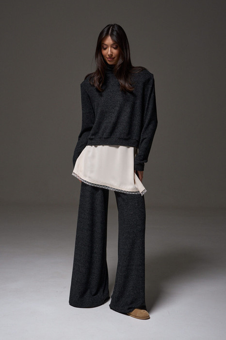 Брюки прямого кроя выполнены из трикотажного ворсистого полотна графитового цвета. Характеристики: прямой крой, пояс на резинке на подгибе. Длина брюк по боковому шву 119 см.