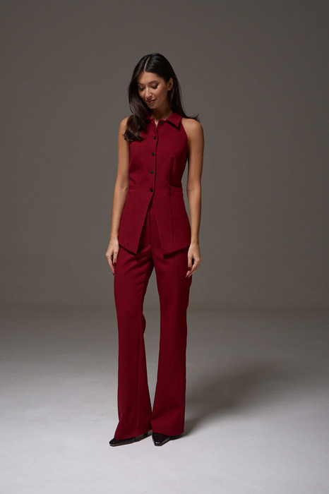 Брюки полуприлегающего силуэта с разведением к низу. Характеристики: полуприлегающий силуэт, пояс стабильный, по переднему и заднему полотну брюк стрелки, по заднему полотну прорезные кармашки обманки, длинна брюк по боковому шву 112 см.