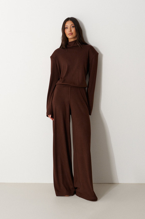 Брюки свободного кроя. Выполнены из мягкого трикотажа коричневого цвета. Пояс на резинке Застёжки нет, карманов нет. Длина бокового шва (с учётом пояса) 114 см