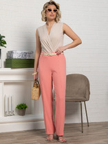 Брюки длинные, прямого силуэта. Выполнены из трикотажного полотна голубого цвета. Характеристика: брюки цельнокроенным поясом на резинке. В боковых швах потайные карманы. Низ обработан в подгибку с открытым срезом на распошивальной (плоскошовной) машине. Длина брюки по боковому шву 107 см.