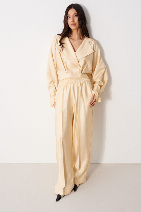 Брюки прямого свободного кроя. Характеристики: прямой крой, пояс на широкой резинке, в боковых швах карманы, на передних и задних частях брюк заутюжены стрелки, без подкладки. Длина брюк по боковому шву 115 см.