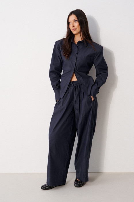 Брюки свободного кроя. Выполнены из хлопковой (смесовой) ткани тёмно-синего цвета. Пояс на резинке, с завязками. Есть прорезные карманы. Длина 103 см