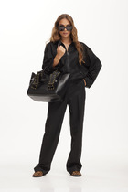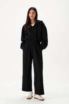Брюки из хлопкового джинса со стрейчем , с четырьмя функциональными карманами и одним отделочным карманом. Пояс на резинке, с кулисой и шнуром. Изделие декорировано металлическими хольнитенами и контрастными отделочными строчками.