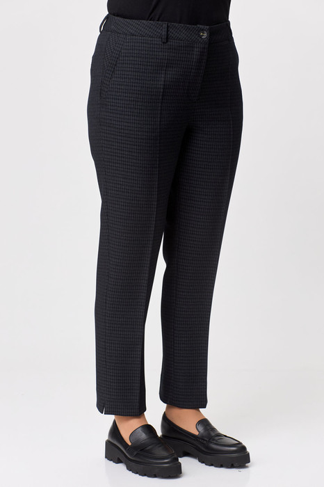 Брюки классические, из плотной текстильной ткани, прямые, слегка заужены к низу, заутюжены стрелки, по переду обработаны карманы с отрезным бочком, застежка на тесьму-молнию и 1 пуговицу. На задних половинках обработаны вытачки и имитация карманов в рамку с двумя обтачками, пояс в брюках притачной. По низу брюк в боковом шве есть небольшой разрез. Длина брюк от талии по боковому шву 96 см.