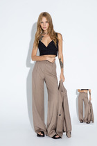 Брюки классические, прямые, слегка заужены к низу, по переду обработаны карманы с отрезным бочком, застежка на тесьму-молнию и 1 пуговицу. На задних половинках обработаны вытачки и имитация карманов в рамку с двумя обтачками, пояс в брюках притачной. По низу брюк в боковом шве есть небольшой разрез. Длина брюк от талии по боковому шву 97 см.