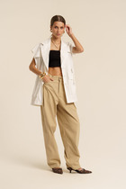 Брюки-палаццо, средней ширины,из плотной текстильной ткани,на сезон осень-зима, выполнены с карманами с отрезным бочком в боковом шве. Пояс притачной, застёжка на молнию. По задним половинкам обработаны вытачки.По боковым швам резинка. Длина по боковому шву 108 см.