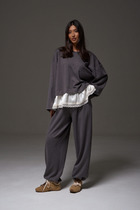 Брюки прямые, классические, с заутюженными стрелками, по переду обработаны карманы с отрезным бочком, застежка на тесьму-молнию и 1 пуговицу. На задних половинках обработаны вытачки и имитация карманов с листочкой, пояс в брюках притачной, по боковым швам резинка. Длина брюк от талии по боковому шву 103 см.