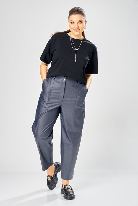Брюки, зауженные к низу, по передним половинкам накладные карманы, застежка по линии банта на молнию, на задних половинках отрезная кокетка и накладные карманы. Верх брюк на пояса с застежкой на кнопки.