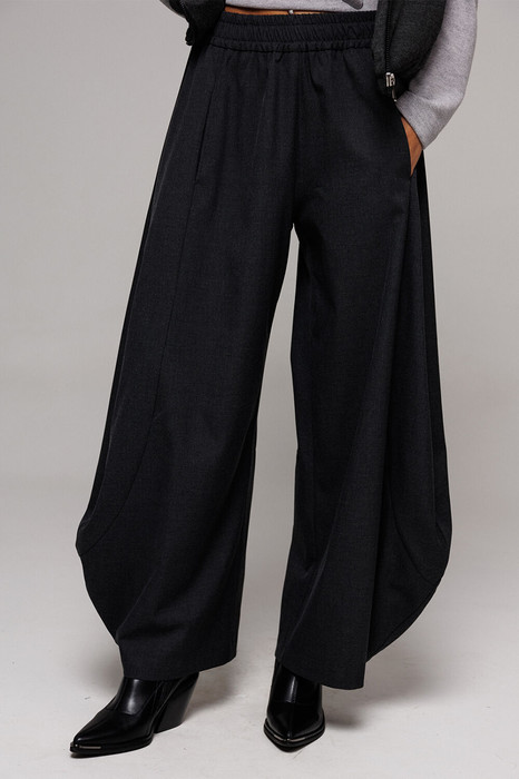 Брюки-шаровары из эко-кожи свободного силуэта, зауженные к низу, на притачном отсроченном поясе со вставленной в него резинкой. Полочка с карманом в рельефе. По переду и спинке фигурные рельефы.