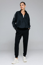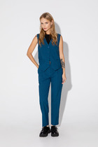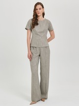 Брюки из трикотажного полотна с велюровым эффектом прямого силуэта на цельнокроеном отстроченном поясе со вставленной в него резинкой и декоративным шнурком. По бокам отрезной бочок с кантом и карманом в шве притачивания бочка.