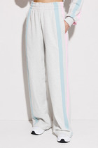 Брюки мультиколор трикотажные (2-хнитка) прямого силуэта на цельнокроеном отстроченном поясе со вставленной в него резинкой и декоративным шнурком. По бокам лампасы из ткани другого цвета и карманом-листочкой от бокового шва.
