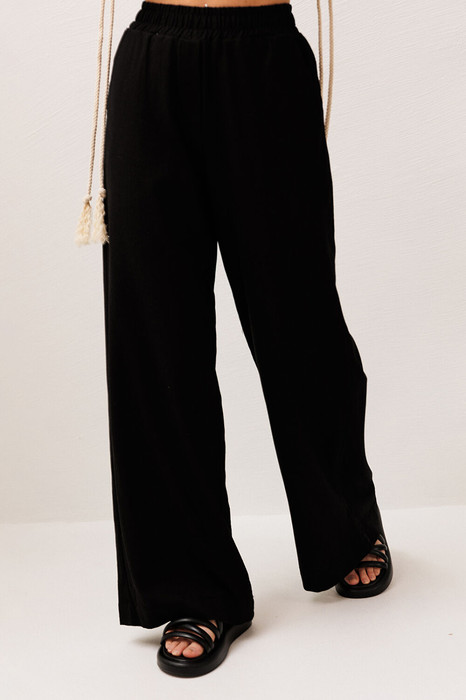Брюки немного расширенные к низу, на притачном, отстроченном поясе на резинке, с карманами в боковых швах. Вверху по переду имитация застежки-гульфик.