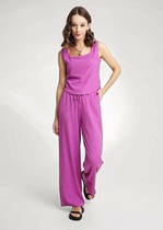 Брюки – из полотна с набивным рисунком в полоску, слегка зауженные книзу, с эластичной тесьмой по талии и притачными манжетами по низу. В центре переда по верхнему срезу прикреплен небольшой декоративный бантик из узкой атласной ленты.