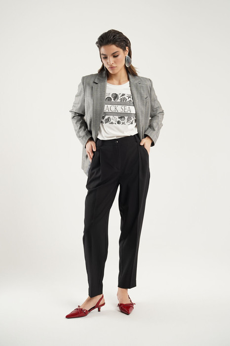Брюки классические со стрелками, складками по переду, слегка зауженные к низу. По переду прорезные карманы с листочкой. Застежка на молнию и петлю с пуговицей. Пояс отрезной с вставкой эластичной тесьмы по спинке. Длина по боковому шву с учетом пояса - 98 см.