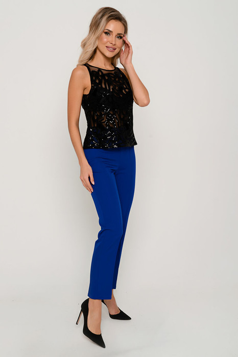 Особенностью модели является высокая посадка брюк с облеганием по фигуре.