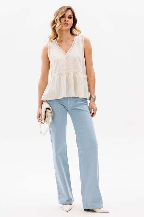 Брюки выполнены из джинса. Брюки прямого силуэта, на притачном поясе, длиной в пол. Спереди боковые карманы с фигурным входом. Застежка спереди на молнию с гульфиком и пробивную пуговицу. Сзади накладные карманы, декорированные нашивкой. Рекомендуется перед корректировкой длины изделие постирать.