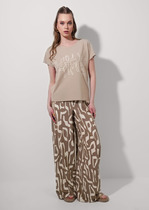 Брюки палаццо с притачным поясом из мягкой вельветовой ткани. Спереди застежка гульфик на молнии и петлей и пуговицей по поясу. По задней частям брюк вытачки. Пояс с резинкой в боковых частях. Брюки с заутюженными стрелками. Длина брюк с учетом пояса - 109 см.