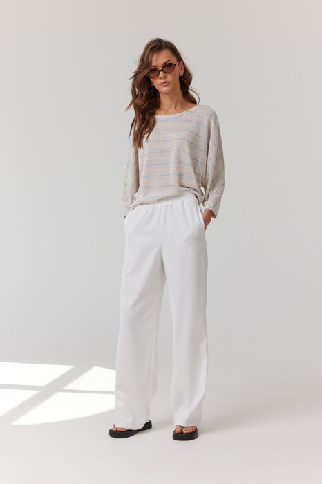 Брюки женские, расширенные. По переду обработаны карманы с наклонным входом. На задних половинках брюк застрочены вытачки. Верх обработан широким притачным поясом с резинкой. Цвет материала может отличаться по тону в зависимости от настроек вашего монитора!