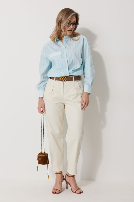 Брюки женские типа «бананы». По переду обработаны фигурные карманы, застежка на молнию, отстрочены складки. Сзади фигурная отстрочная кокетка и фигурные накладные карманы, декорированные металлическими хольнитенами. Верх обработан притачным поясом со шлевками, застегивающимся на кнопку. По низу брюк спереди и сзади отстрочены вытачки.
