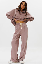 Брюки укороченные, на притачном поясе имеются шлевки. Застёжка на молнию и джинсовую пуговицу. По переду изделия расположены функциональные боковые карманы с декоративной отстрочкой, по задним половинкам карманы-обманки с листочкой. Низ изделия ассиметричный-передние половинки брюк короче, а задние половинки длиннее. Эти удобные брюки - отличный вариант для повседневной носки.