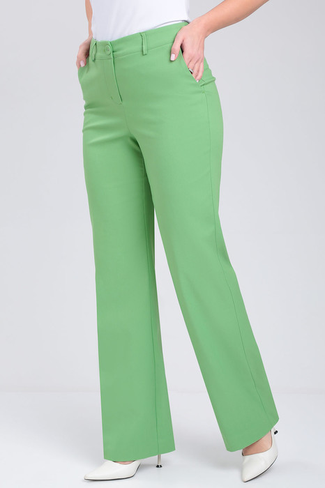 Прямые брюки на притачном поясе со шлевками. Застёжка спереди на молнию, обтяжную пуговицу и петлю. По переду изделия расположены функциональные боковые карманы.