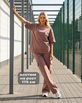 Брюки молодежные из тканого полотна с набивным рисунком в полоску, свободного покроя, с карманами в боковых швах, на притачном поясе с эластичной тесьмой внутри.