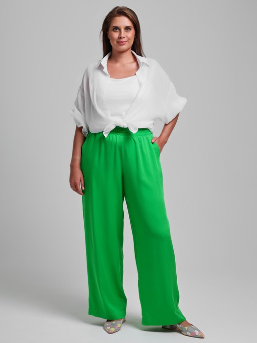 Брюки женские из гладкокрашеного тканого штапельного полотна, свободного покроя, удлиненные, с карманами в бокавых швах, на притачном поясе с эластичной тесьмой внутри.