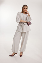 Брюки прямого кроя. Передние половинки брюк с двумя складками по переду и застёжкой по типу «гульфик». Верхний срез брюк обработан притачным поясом со шлёвками, по бокам вставлена резинка. В боковых швах карманы «хулиганы».