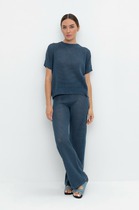 Брюки прямого силуэта расширенные книзу из костюмной ткани. По верху брюк  притачной пояс с застежкой на петли и пуговицы. На передних половинках обработана застежка молния в среднем шве. На передних половинках карманы и декоративные складки. По поясу задних половинок брюк резинка и вытачки. Обращаем ваше внимание, что фурнитура может отличаться от фото.