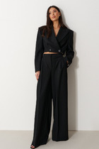 Брюки из костюмной ткани, зауженные книзу. По верху брюк притачной пояс с застежкой на петлю и пуговицу и шлевками для ремня. По поясу задних половинок брюк резинка. На передних половинках обработаны боковые карманы и застежка молния в среднем шве. По верху и низу брюк расположены встречные складки. По низу брюк – манжеты. На задних половинках накладные карманы.