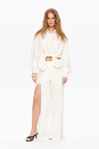 Брюки из поливискозной ткани, прямого, расширенного силуэта. На передних половинах брюк по одной складке, выходящих из-под пояса. По переду застежка на молнию по типу гульфик. Брюки по переду с карманами в отрезных бочках. Пояс по переду с застежкой на хлястик, продевается через металлическую рамку и застегивается на две металлические пуговицы на ножке. Обращаем Ваше внимание, что фурнитура может незначительно отличаться от фото. По спинке в пояс вставлена резинка. На задних половинах брюк вытачки.