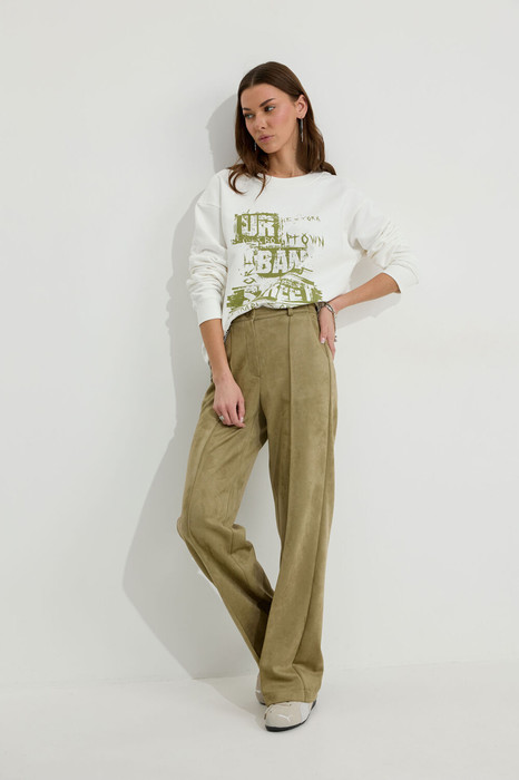 Брюки прямого силуэта из трикотажного полотна “замша”. По верху притачной пояс с застежкой на петлю и пуговицу и шлевками для ремня. На передних половинках обработаны карманы, канты и застежка молния в среднем шве, на задних – вытачки. По поясу задних половинок брюк эластичная тесьма (резинка). Обращаем ваше внимание, что фурнитура может отличаться от фото. Декоративный элемент - цепочка в комплектацию не входит.