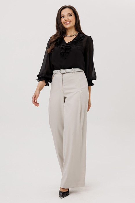 Брюки женские свободного силуэта с высокой посадкой, максимальным расширением от бедра (палаццо). Брюки на притачном поясе. По переду складки в центрах половинок брюк и застёжка на молнию с гульфиком и откоском. Талевые вытачки по задним половинкам брюк.