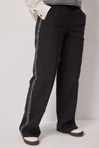 Брюки выполнены из эко кожи, на притачном поясе, зауженные к низу. По переду гульфик, застёжка на пять прорезных петель и пуговиц, фигурные накладные карманы. По спинке в пояс продета широкая резинка и накладные карманы. Украшает брюки двойные контрастные отделочные строчки.