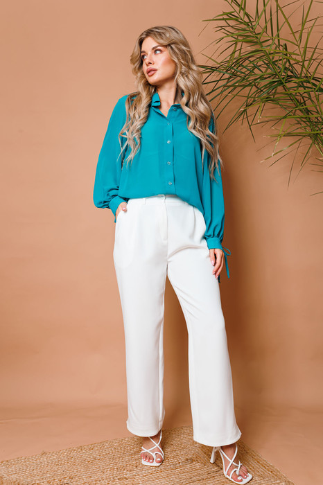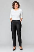 Брюки средней посадки, свободные вверху, слегка зауженные к низу с наклонными боковыми карманами. Низ брючины фигурный. Пояс широкий отрезной, сзади на эластичной тесьме-резинке, по переду застежка на петлю и пуговицу.