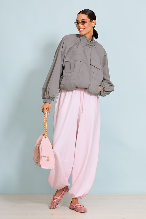Брюки  выполнены из премиального трикотажного полотна.  Брюки  свободного кроя, пояс  на резинке. Карманы в  боковых швах.   Передние и задние половинки брюк  с дополнительными выточками по низу. Низ брюк на резинке. Сзади прорезной карман-обманка.  По поясу вставлен декоративный шнурок.