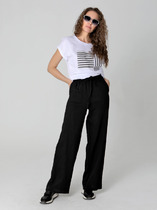 Брюки выполнены из джинсовой ткани, расширены к низу. На передней и задней половинках отстрочены стрелки до контрольных точек. На задней половинке – кокетка и накладные карманы. На передней половинке – боковой карман, с правой стороны – маленький накладной кармашек. Верхний срез обработан поясом со шлевками. Низ брюк с широкой манжетой на изнаночную сторону джинса.